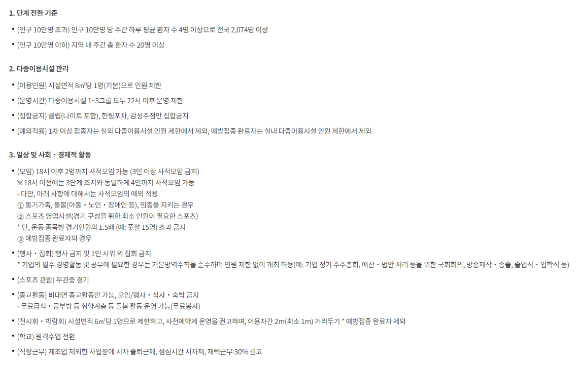 정부가 사회적 문제를 논의한 지 며칠이 지났습니다. 사회적 거리 두기 4단계 격상의 내용을 살펴보겠습니다. 7일 자정 기준 주간기준은 코로나입니다. 1,000명 이상의 사람들이 세 번째 전염병이 올 것을 걱정하고 있습니다. 단어들이 많고 그것들은 천천히 나옵니다.
